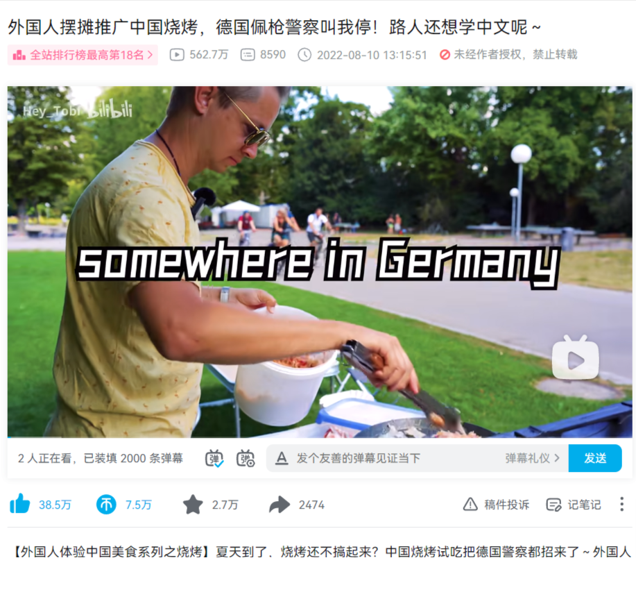 去年8月,B站德国UP主@Hey_Tobi 发布了一个vlog,讲述他带着中国进口的烧烤设备,在柏林一个公园摆摊,现场做东北酸菜烤肉,并邀请经过的路人吃。大家都发现非常好吃,表示还想来吃第二次。结果因为太热闹,引来警察,考虑到火灾隐患,他的烧烤摊只能收档。最后,这个视频在B站获得超过560万的播放量。