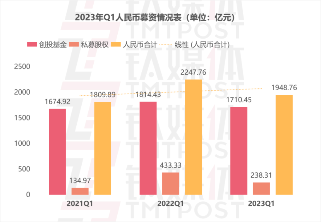 根据已公开数据,2023年Q1创投类和私募股权类基金,共新募集人民币1948亿,预期完全公开数据能与去年2247亿的数据基本持平,但值得关注的是,其中创投类基金的募资占比下滑近10%。