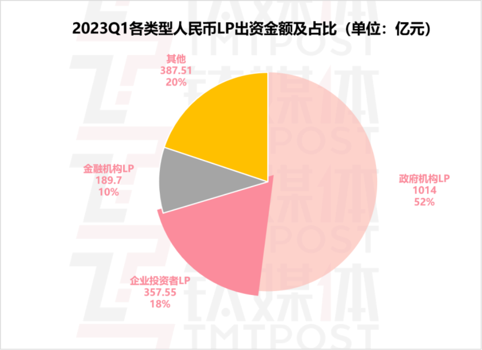 进一步关注到出资的LP结构,2023年Q1各类型人民币LP出资占比中,政府机构LP出资依旧坚挺,共出资1014亿,占比52%,企业投资者LP和金融机构LP各占18%和10%。从政府基金LP所在地域来看,出资最多的前五个地区为浙江省、江苏省、广东省、上海市、山东省。