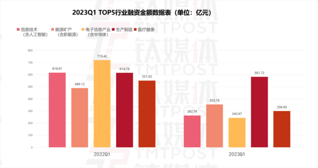 2023年Q1,融资总金额最多的5个赛道分别是:生产制造、能源矿产(含新能源)、医疗健康、信息技术(含人工智能)、电子信息产业(含芯片、半导体)。 TOP5赛道同去年同期相比,没有发生变化。