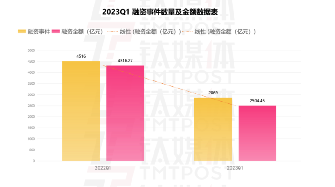 与投资人们重回工作节奏巅峰的体感有些差异,根据已公开数据,2023Q1共发生融资事件2869起,融资总金额2540.45亿,融资事件数同比下滑36%,融资总金额同比下滑40%。