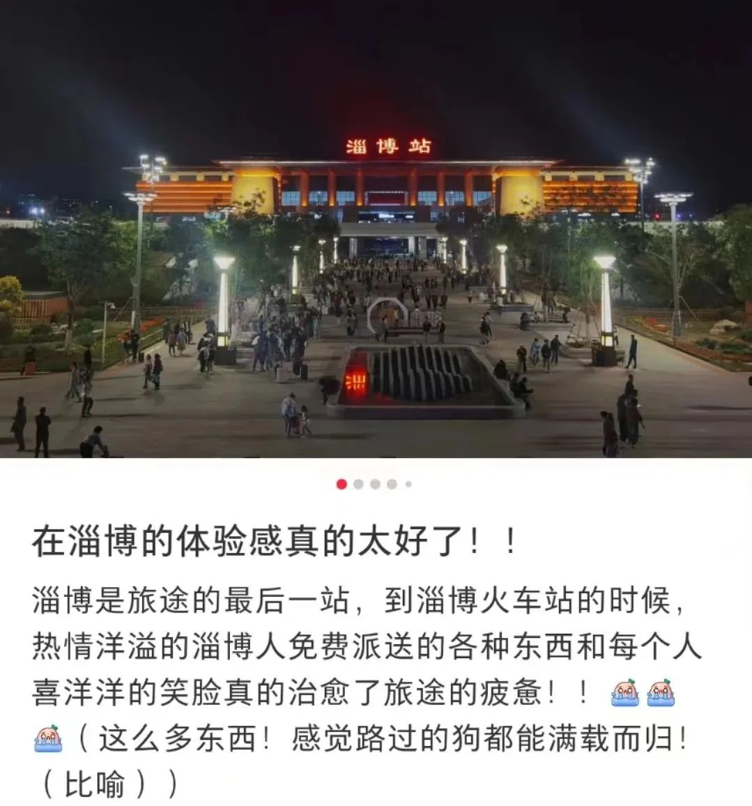 最先是淄博文旅局在高铁上派发“烧烤套餐”,引发全网羡慕,之后是热情的淄博人自发组织车队,免费接送各地游客。随后的警察夜市巡逻、商家提醒食客不必排长队、公厕里准备卫生巾……