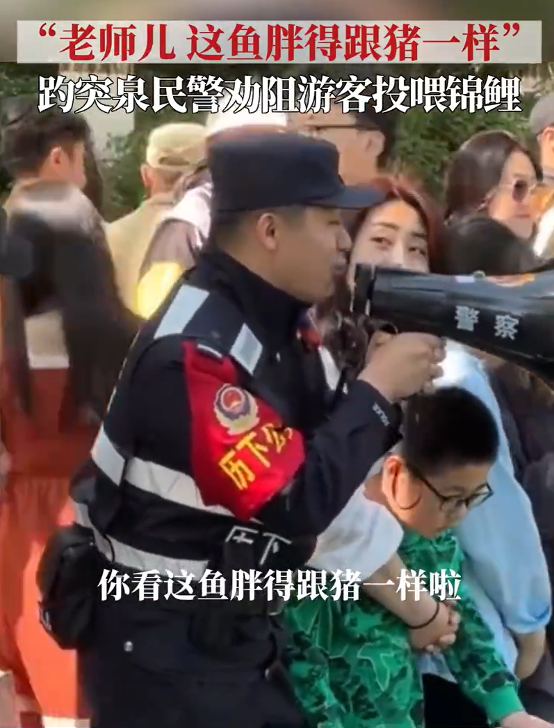 这里有幽默的劝导。最近这个五一假期,济南著名的趵突泉前人流如织,面对纷纷投喂金鱼的游客,维持秩序的警察登上了热搜:“老师儿,别往水里投鱼食了,你看这鱼,胖得跟猪一样了!”山东人特有的一本正经式的幽默,逗乐了屏幕外的人们;