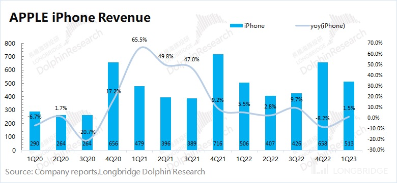 2023 财年第二季度 iPhone 业务收入 513 亿美元,同比增长 1.5%,超彭博一致预期(489 亿美元)。本季度整体手机市场下滑 14.6%,公司手机业务逆势增长,主要得益于公司领先的行业地位。