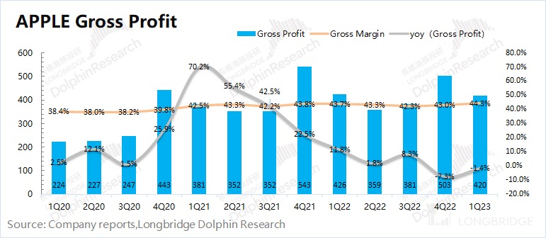 1)iPhone 出货量:在本季财报披露前,IDC 已经对季度各品牌出货情况做了披露。受疫情、通胀等因素影响,2023 年第一季度全球智能手机市场同比下降 14.6%。凭借自身的产品力,苹果公司的市场份额继续从 18% 提升至 20.5%。公司本季度出货量仅下滑 2.3%,明显优于行业水平;
