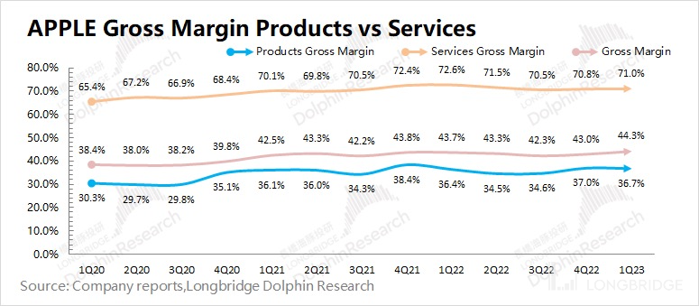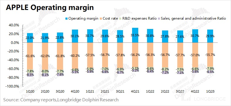 ②毛利率的闪光点:展现了产业链地位。在需求疲软的大背景下,其实整个手机及电子产品产业链的盈利能力都有明显的下滑,而苹果硬件端仍能达到 36.7%。这主要得益于公司产业链的地位。即使遇到成本提升、盈利能力下滑的情况,苹果也能将风险转嫁出去。