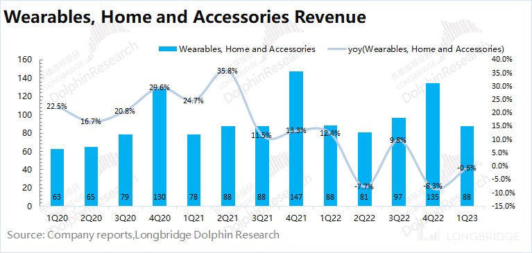 2023 财年第二季度可穿戴等其他硬件业务收入 88 亿美元,同比下滑 0.6%,超彭博一致预期(83.5 亿美元)。苹果的可穿戴等其他硬件业务本季度的跌幅有所收敛,旅游等需求的回暖,部分带动可穿戴设备的需求提升。部分产品的回暖,抵充了可穿戴等硬件业务的下滑表现。