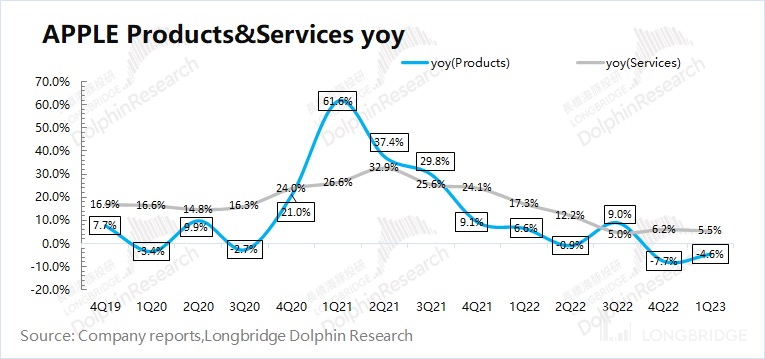 3、iPhone 以外其他硬件:需求疲软,终究还是下滑。Mac 业务继续大幅下滑 31%,主要是渠道端完成补库后,当前拉货动力不足。iPad 业务的表现中规中矩,居家办公等需求回落后,整体表现趋于平稳。可穿戴等硬件产品本季的跌幅有所收窄,主要是业务中部分产品的需求有所回暖;