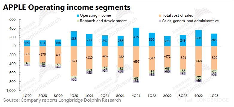 1.3 经营利润:2023 财年第二季度苹果公司经营利润 283 亿美元,同比下滑 5.5%。苹果公司本季度经营利润的下滑,主要是费用端增长所致。