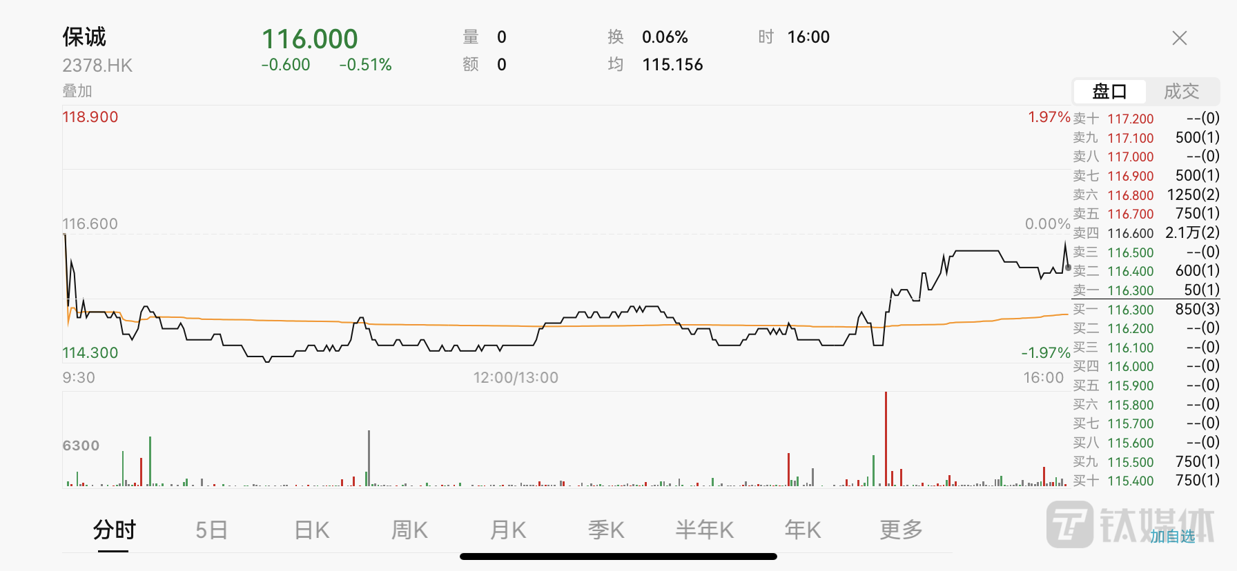 二级市场方面,截至5月5日股市收盘,保诚股价报收116.3港元,微跌0.26%,成交额为1292.62万港元,当前公司总市值为3201.98亿港元。
