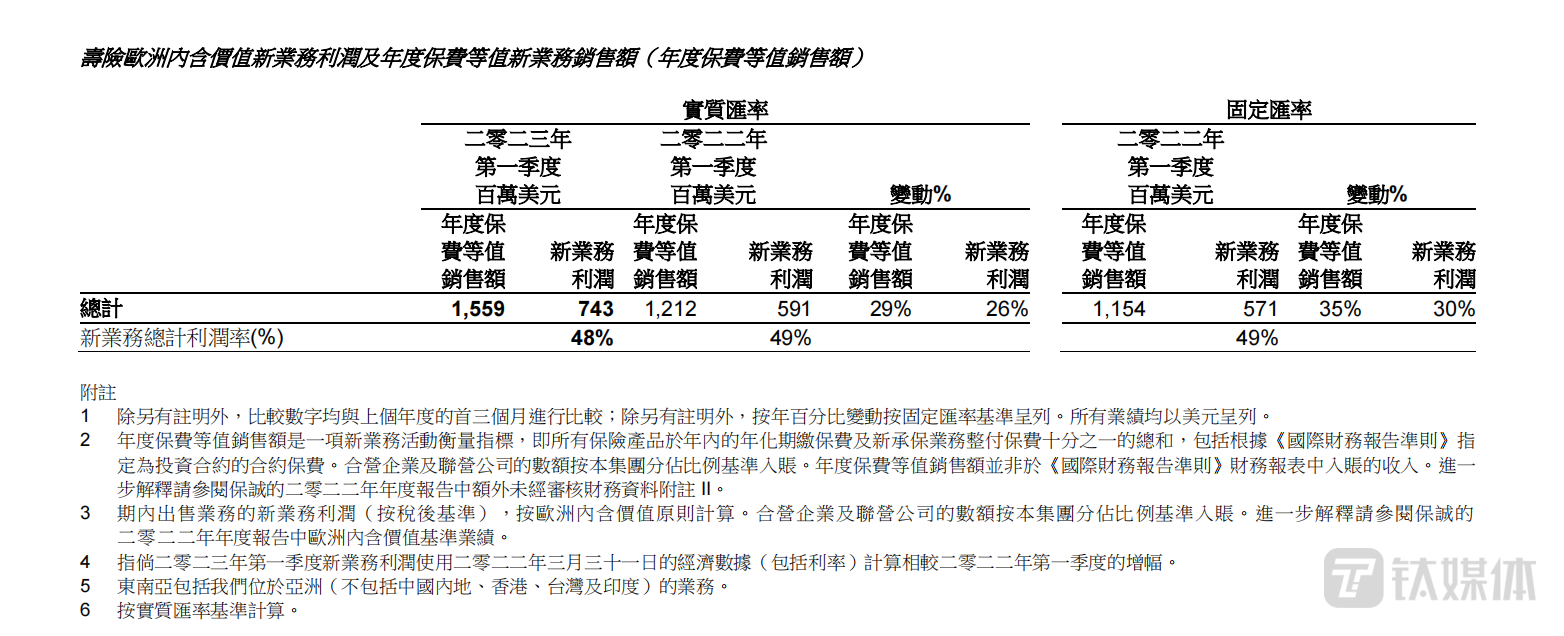 4月28日午间,保诚发布2023年第一季度业务,按固定汇率基准,年度保费等值销售额同比增加35%至15.59亿美元,主要是受到中国内地跨境流量增加、中国香港本地需求上升,以及公司旗下多个其他业务单位取得增长的推动。