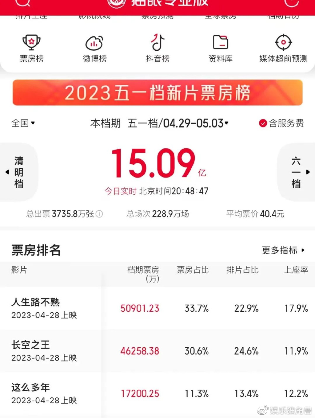 但是,需要看到的是,五一旅游爆火,一定程度上分流了观众。从票房数据来看,2022年疫情导致影院关停忽略不计,5天15.19亿的票房表现,低于2021年的16.74亿,也低于2019年的4天15.27亿。前四天观影人次总计3255.38万人,对比2021年的3875.71万人,2019年的3509.36万人也有所下滑。而从社交媒体热度等方面来看,五一档的声量并没有非常大,没有真正破圈、达到全民热议级讨论度。总的来看,五一档有喜有忧,前电影局长张宏森的发声,更是引发了行业广泛关注。