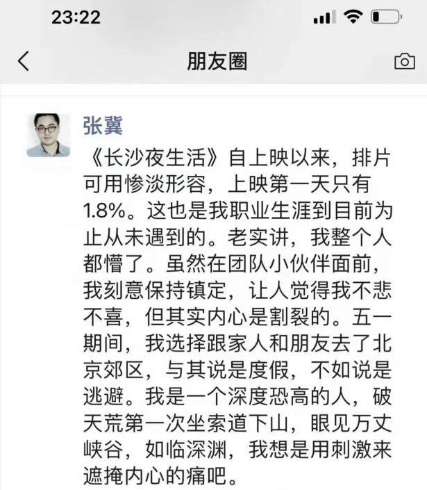 《长沙夜生活》导演编剧张冀发文称:“排片可用惨淡形容,上映第一天只有1.8%。这也是我职业生涯到目前为止从未遇到的。老实讲,我整个人都懵了。虽然在团队小伙伴面前,我刻意保持镇定,让人觉得我不悲不喜,但其实内心是割裂的。”