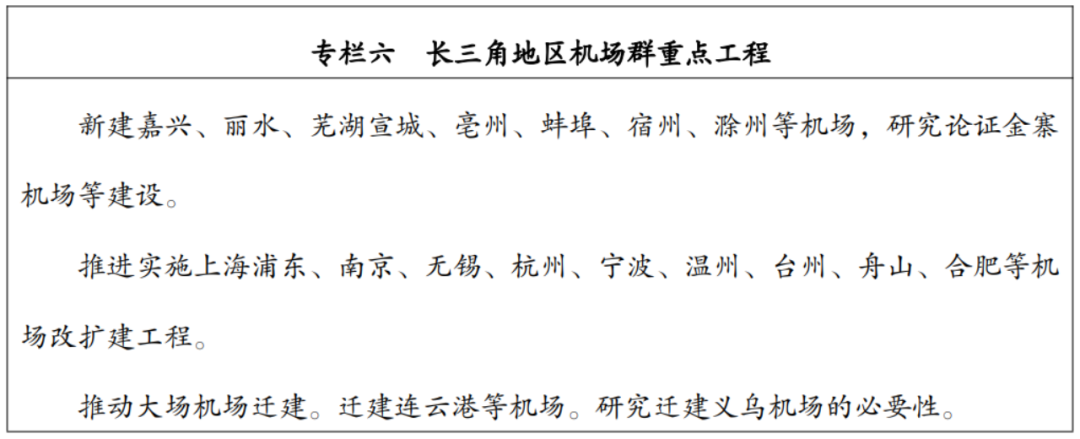 《长江三角洲地区民航协同发展战略规划》中提到了地区机场扩迁建的重点工程规划:新建嘉兴、丽水、芜湖宣城、毫州、蚌埠、宿州、滁州、宿州等机场,研究论证金寨机场等的建设;加快推进上海浦东、南京、无锡、杭州、宁波、温州、台州、舟山、合肥等机场的扩建工程;推动大场机场、连云港等机场的迁建,研究义乌机场迁建的必要性等。