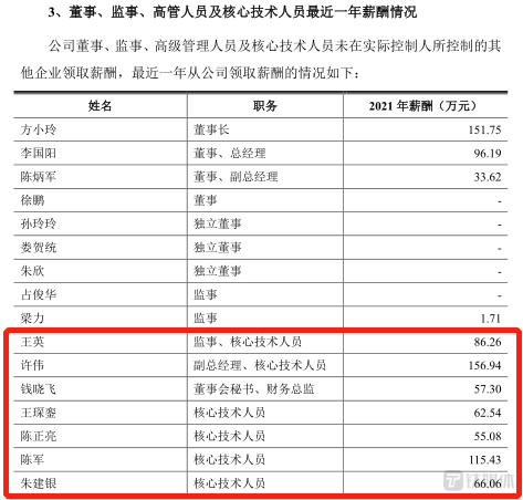 可见,方刚在联芸科技的年薪超过百万,且2021年的年薪除了低于许伟之外,均高于公司其他的核心技术人员。