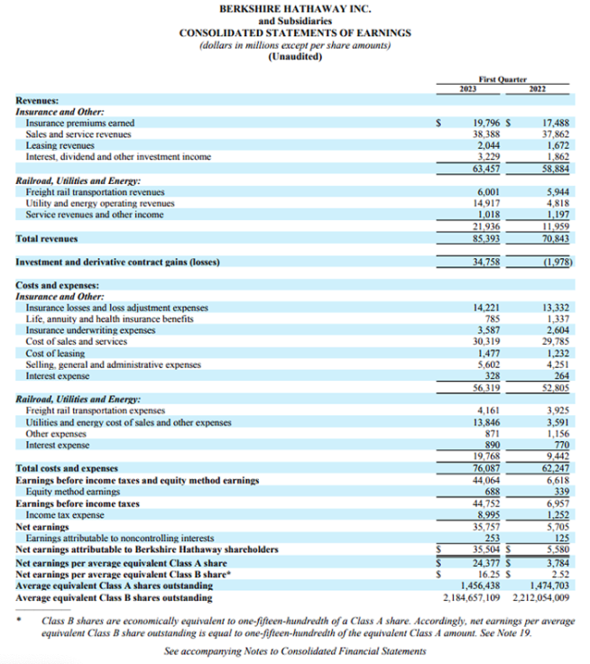 相比2022年的净亏损,2023年一季度业绩“成绩单”优异了许多。数据显示,伯克希尔第一季度净利润为355.04亿美元,去年同期为55.8亿美元;第一季度营收853.93亿美元,去年同期为708.43亿美元;第一季度投资和衍生品收益为347.58亿美元,去年同期为亏损19.78亿美元。