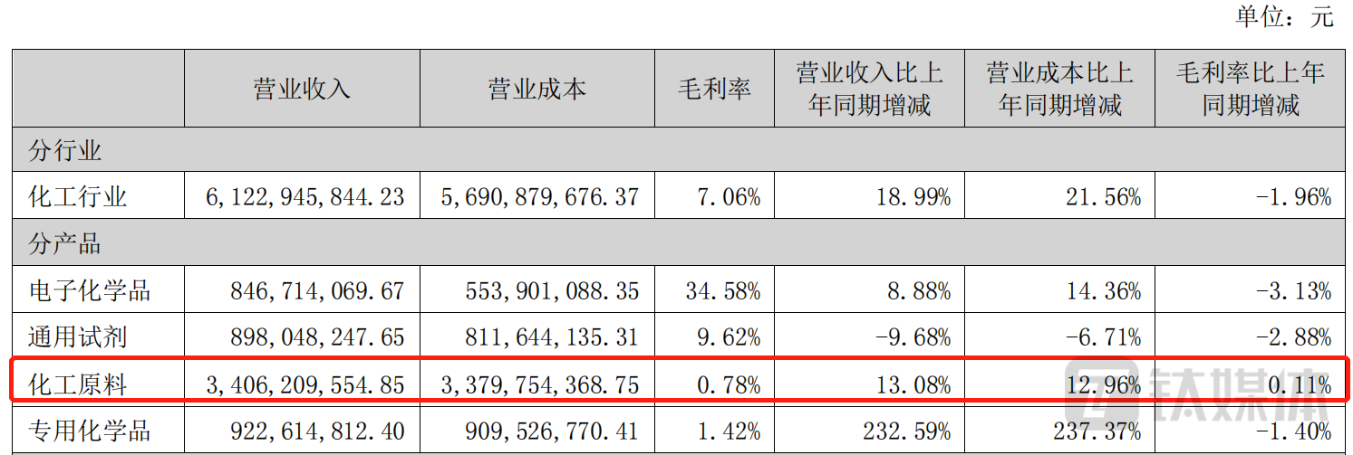 从营业收入来看,化工原料为公司收入的主要来源,然而这项业务的毛利率只有0.78%。也就是说,34亿的巨额营收,毛利润只有265万,如果再摊减部分费用,公司这项业务能否赚钱?
