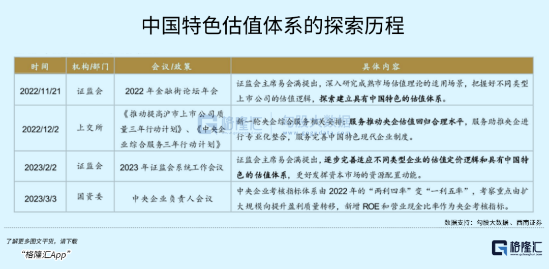 早在2022年11月,证监会主席易会满首次提出建立具有中国特色的估值体系,促进市场资源配置功能更好发挥。紧接着,上交所制定完成新一轮《推动提高沪市上市公司质量三年行动计划》和《中央企业综合服务三年行动计划》。