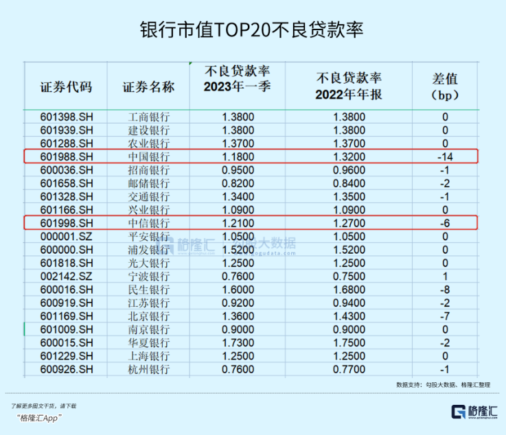 再看两家银行的资产质量表现。一季度末,中行、中信不良贷款率分别为1.18%,1.21%,较去年末下降14bp、6bp。从这个维度看,中行是42家上市银行中不良贷款改善最为明显的银行,而工、建、农均为0。中信银行改善6个bp,也是全国性股份制商业银行中表现最好之一。