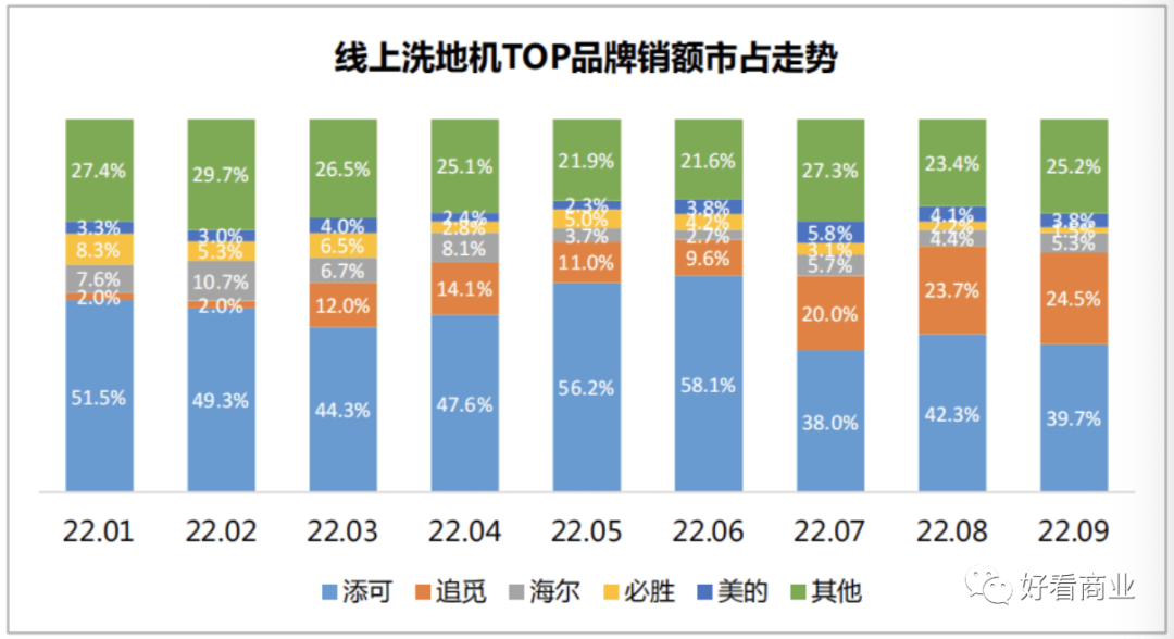 到2022年底,添可洗地机在线下、线上的销量份额分别降至55%、51.9%,而2021年还是70%。添可洗地机的先发优势正在被后来者蚕食。