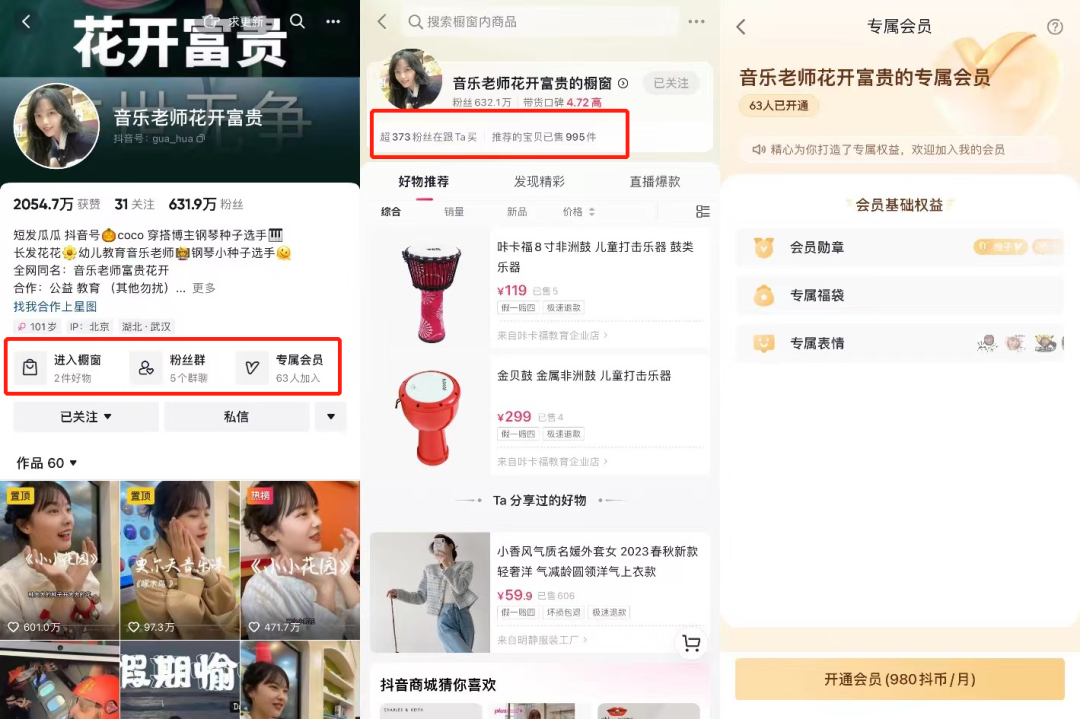目前黄老师账号主页显示的部分商业方式 橱窗内会带货儿童打击乐器