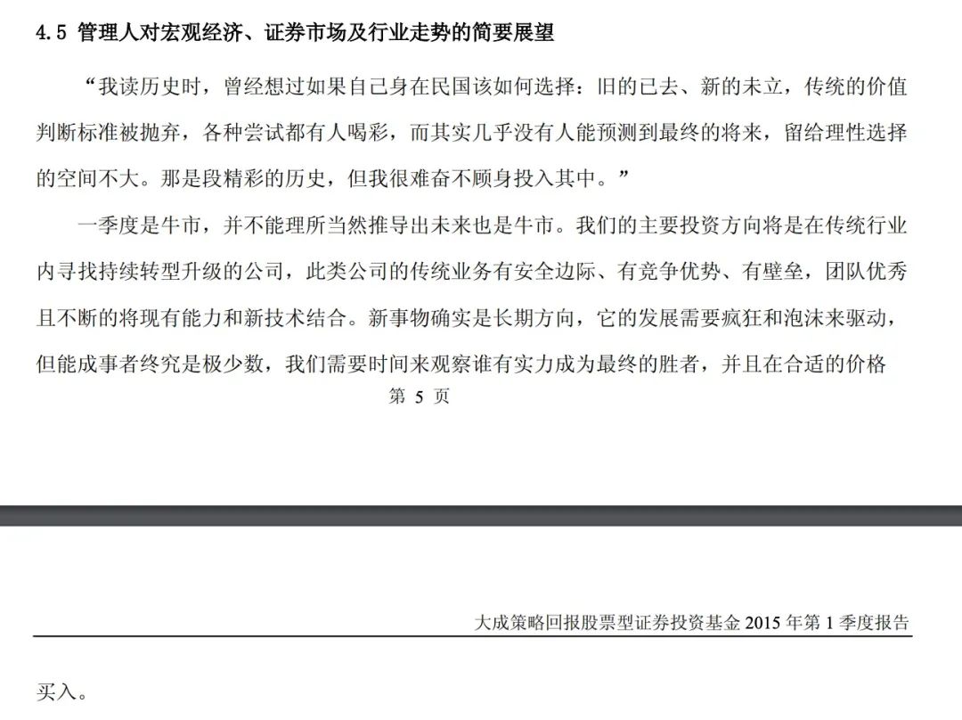 在这一段牛市极端的泡沫博弈中,2015年2季报、半年报、三季报,徐彦连续提到了三次「报告期的市场远比想象的更加疯狂」。徐彦不断强调暴涨的绝大多数股票不符合自己的选股理念,后来尝试去研究了一些新产业公司,认为「产业方向无可置疑,但无法粗暴对应到股票。」