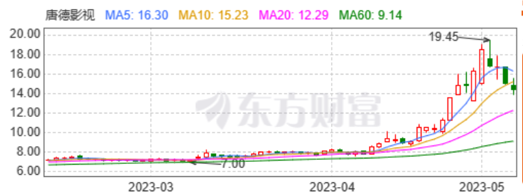 这可让过去跌了六七年的影视公司,多少有些猝不及防。以积压的《巴清传》闻名的唐德影视,公司股票交易价格自2023年4月19日至2023年5月4日连续9个交易日收盘价格涨幅偏离值累计达108.16%,属于严重异常波动的情况。