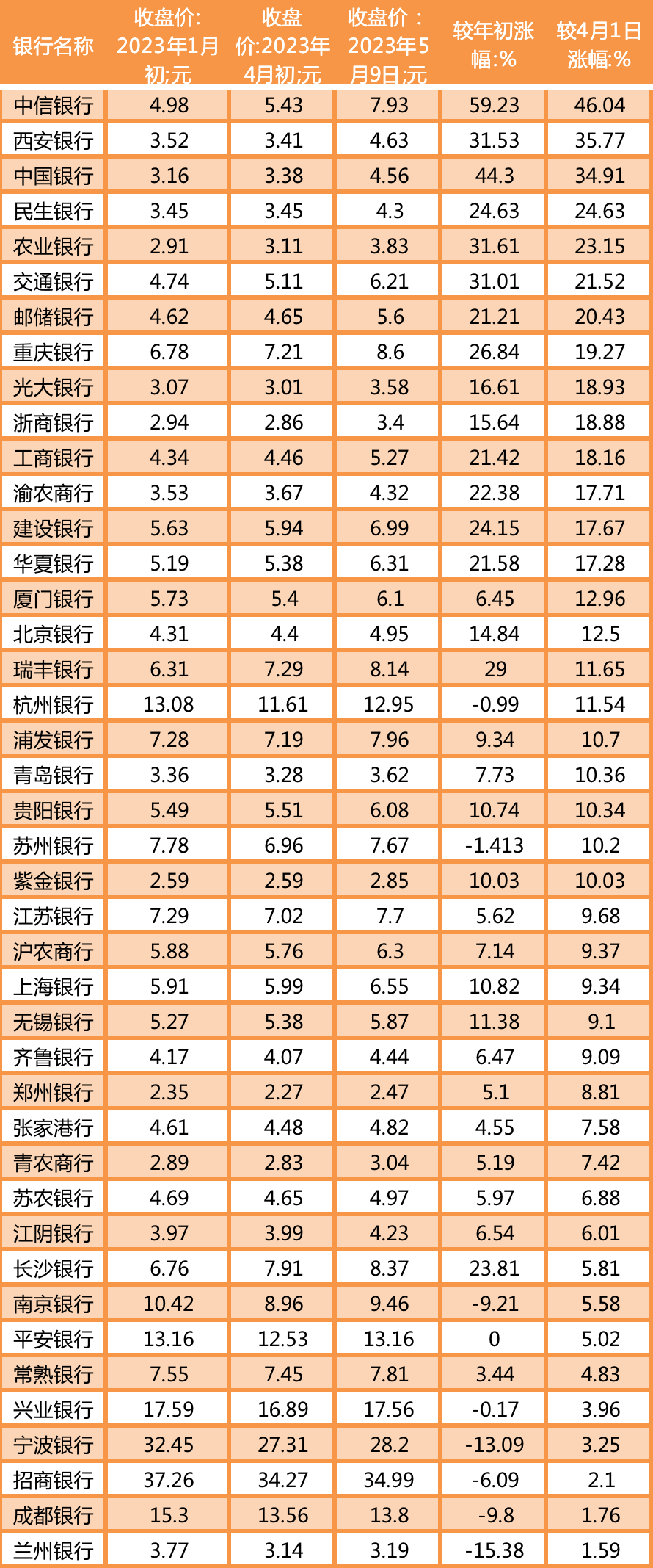 截至5月9日收盘,较2023年初,中信银行的股价上涨了59%,中国银行的股价上涨了44%,农业银行的股价上涨了32%,交通银行上涨了31%,民生银行、邮储银行、建设银行、工商银行等股价也上涨了20%以上。