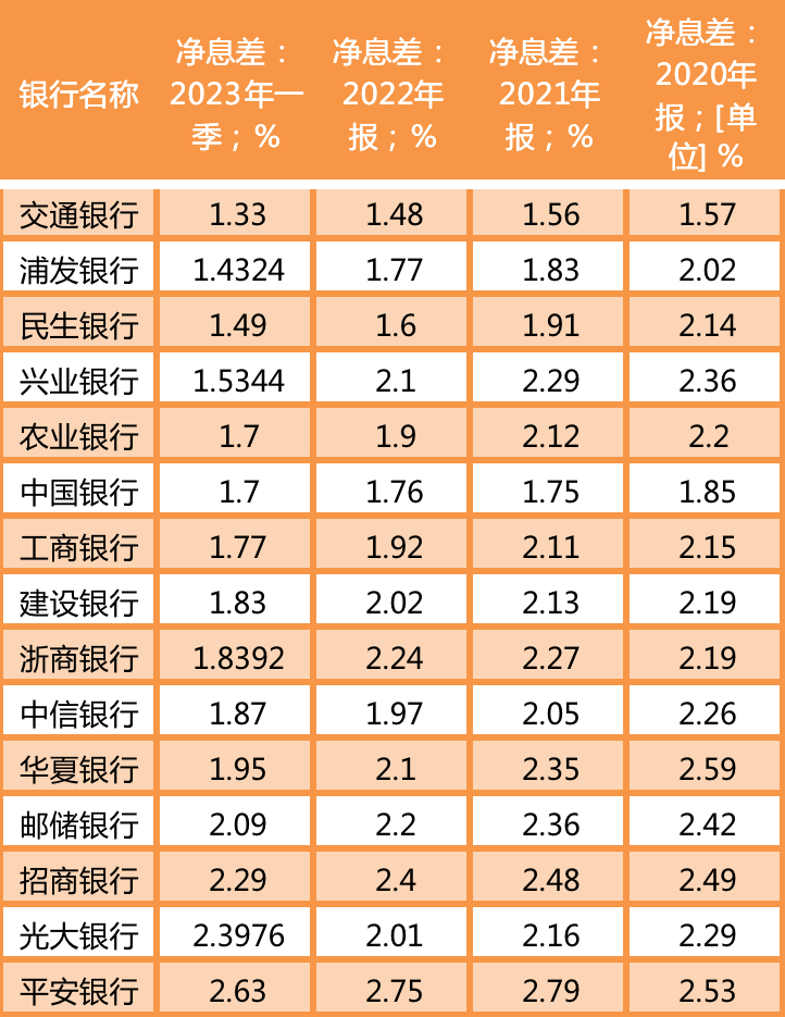 在过去几年,受疫情的影响以及LPR下行等因素的影响,银行的净息差一降再降。截至2023年一季度,交通银行的净息差仅为1.33%,在上市银行中垫底。其他上市银行也表现不佳,除邮储银行,国有大行的净息差均在2%以下。