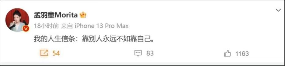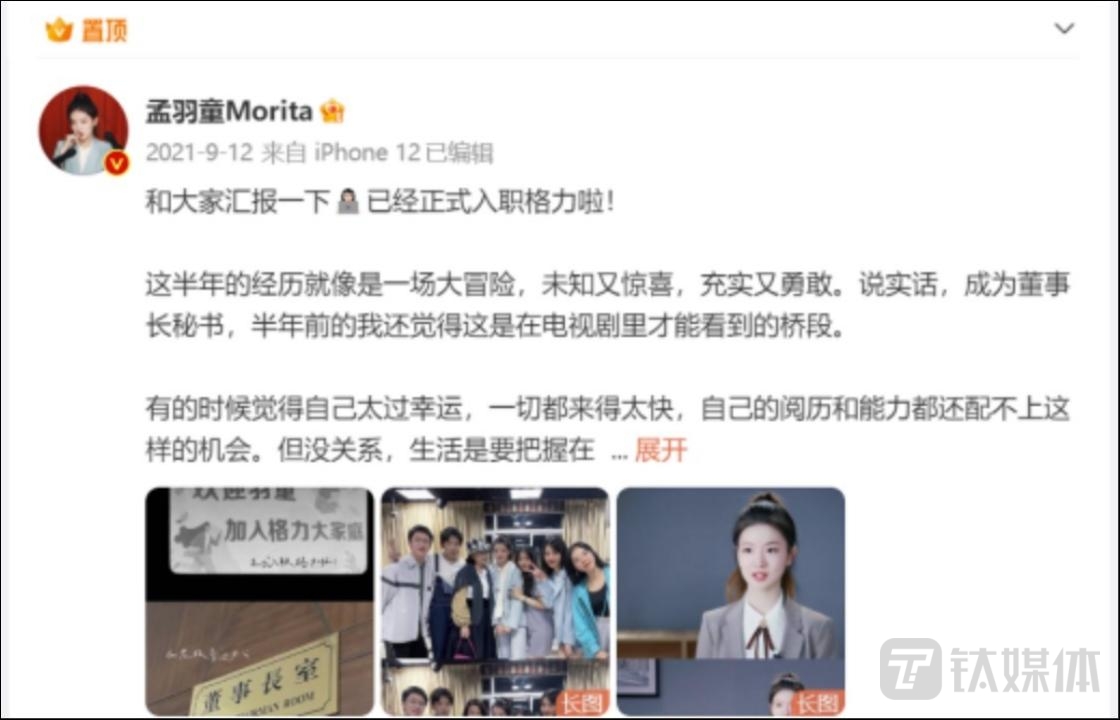 网友也顺势扒出孟羽童本月9号曾发布的微博,她在微博发文称:“我的人生信条:靠别人永远不如靠自己”。随后,该微博被她删除。目前,孟羽童微博置顶仍是2021年9月正式入职格力电器的内容。