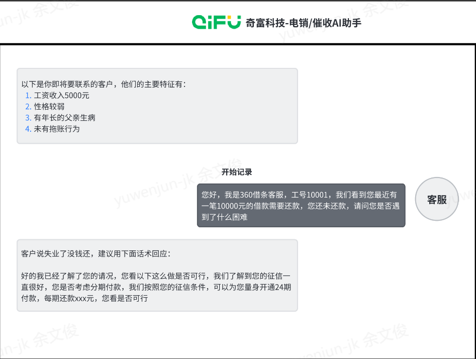 以下面客服对话为例,奇富GPT不仅能形成用户画像,还能捕获用户真实意图,为用户提供还款安排。