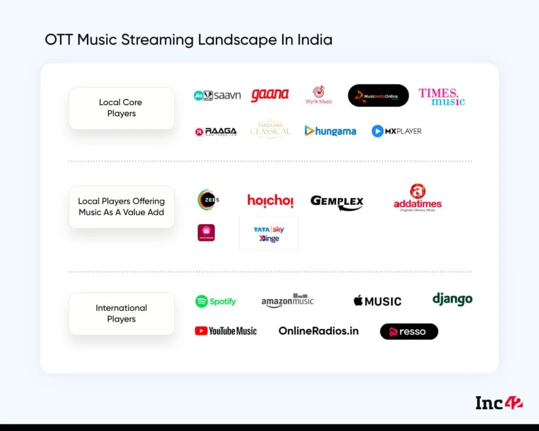 首先,印度市场竞争已经很激烈,除了谷歌和苹果旗下的音乐服务外,还有本土企业JioSaavn(印度本土最大音乐流媒体平台)、Gaana和Wynk Music(印度本土第二大音乐流媒体平台),加上后来者Spotify、Resso等,总共大约有15个玩家。