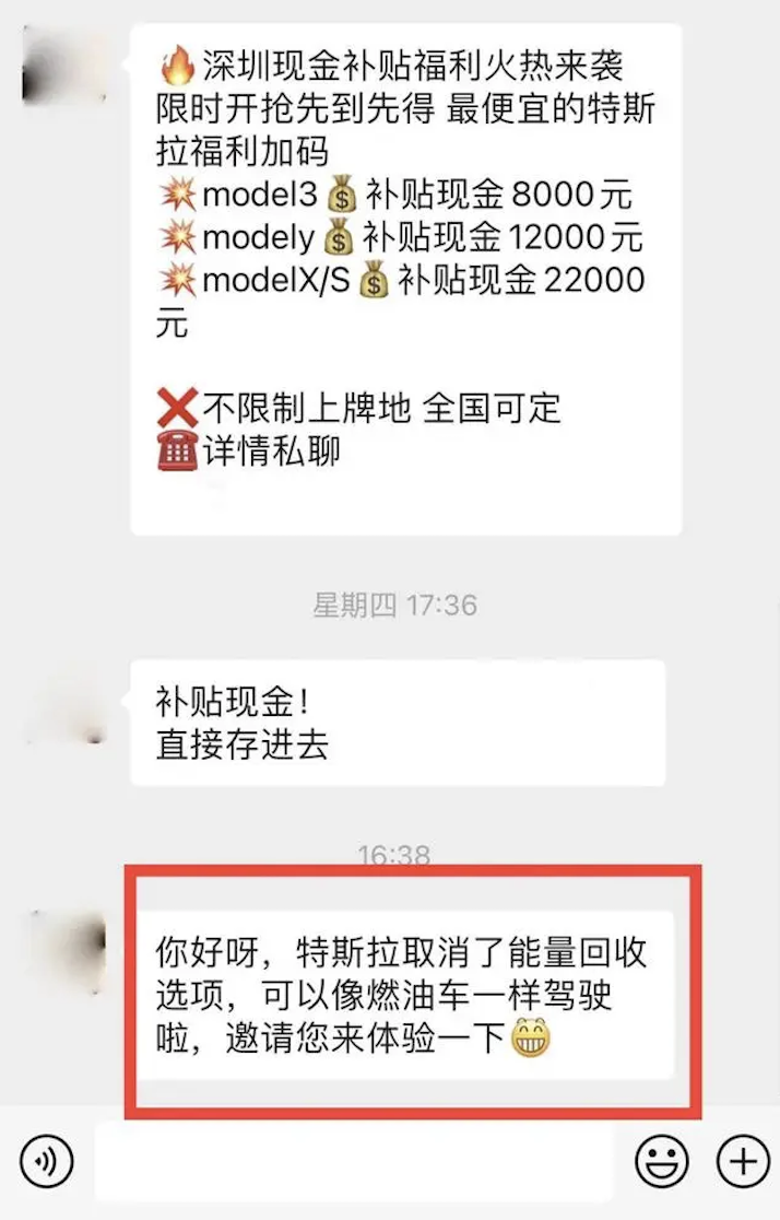 甚至有特斯拉销售向意向车主发消息称,重新恢复“动能回收调节”后,就可以让特斯拉车型“拥有像燃油车一般的驾驶感受”,以吸引对“强制单踏板模式”心有芥蒂的用户下单。