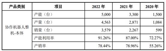 招股书显示,2020年、2021年、2022年,节卡机器人的协作机器人整机产量分别为1084台、2871台和4563台,产能利用率分别为72.27%、87.00%、91.26%,产能即将消耗殆尽。同期,节卡机器人的机械臂销量分别为599台、2267台、3579台,产销率分别为55.26%、78.96%、78.44%。