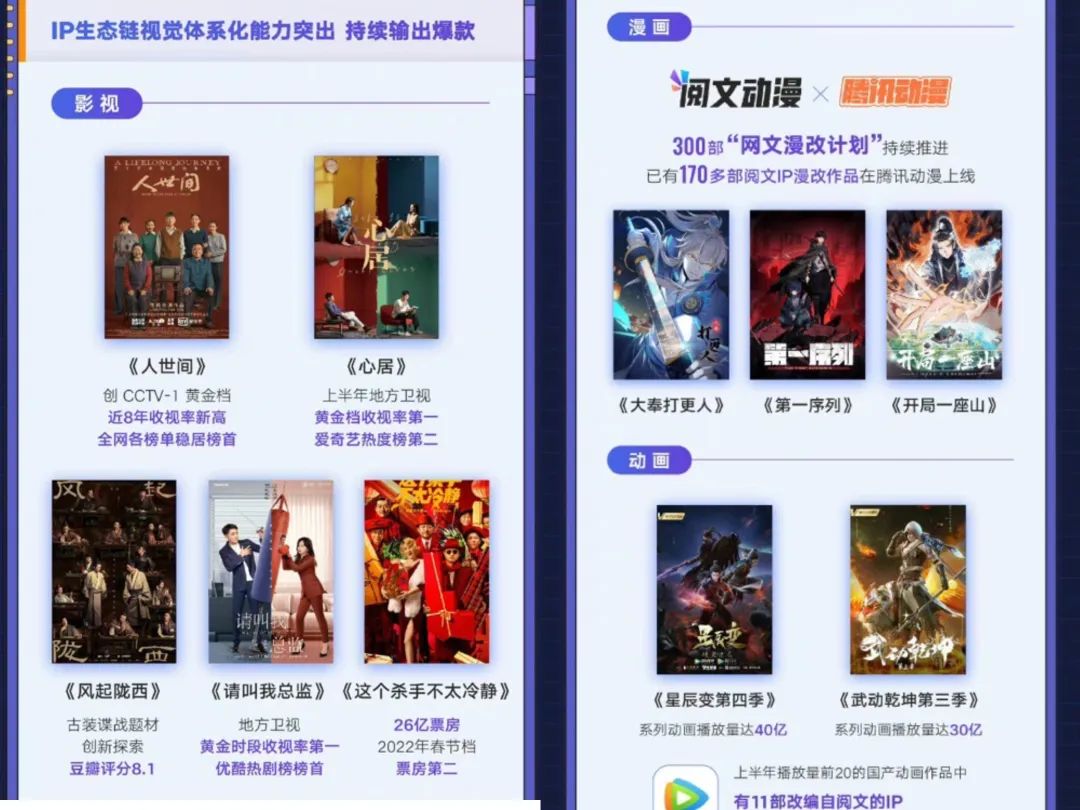 在程武看来,这是“腾讯和阅文进一步加码影视业务布局、进一步驱动数字内容业务耦合以及更体系推动高价值、高品质数字内容生产的‘三驾马车’”。2021年之后,“三驾马车”爆款频出,《赘婿》创下爱奇艺有史以来热度值攀升最快的剧集纪录;《人世间》创央视一套黄金档十年新高。