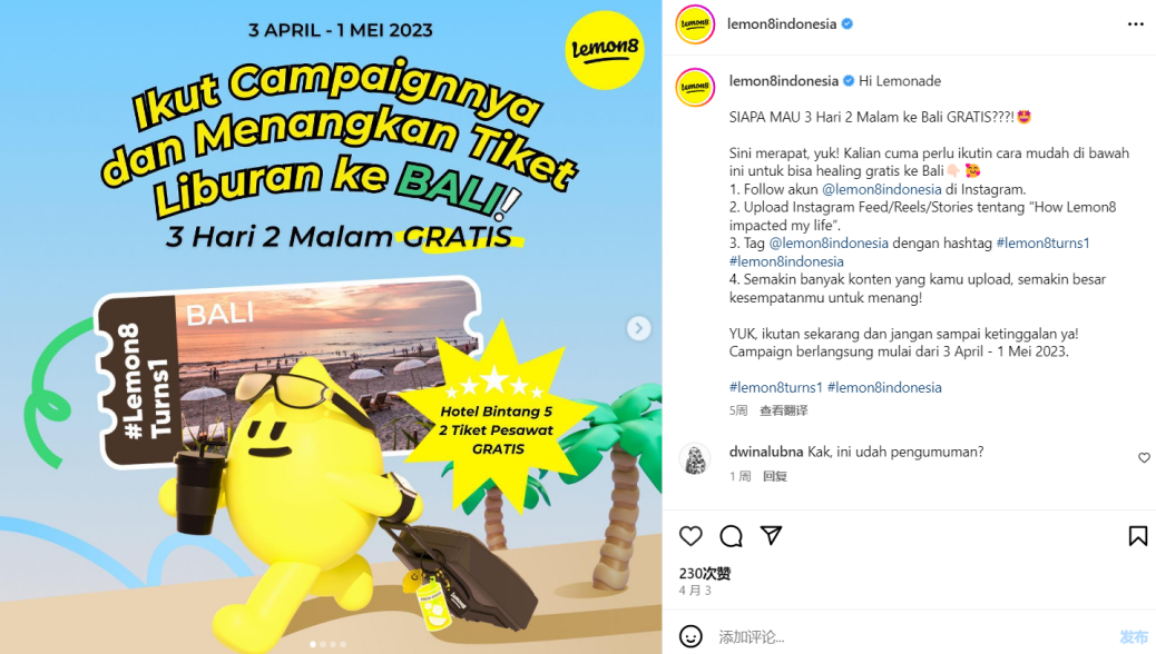在不同国家的社交媒体账号,Lemon8也做了不少有预算的推广活动。例如,4月3日,Instagram上的Lemon8印尼号就发布了营销活动,只要用户在4月3日至5月1日期间上传关于“Lemon8如何影响我的生活”的内容,就有机会获得巴厘岛3天2夜的机票、酒店奖励。
