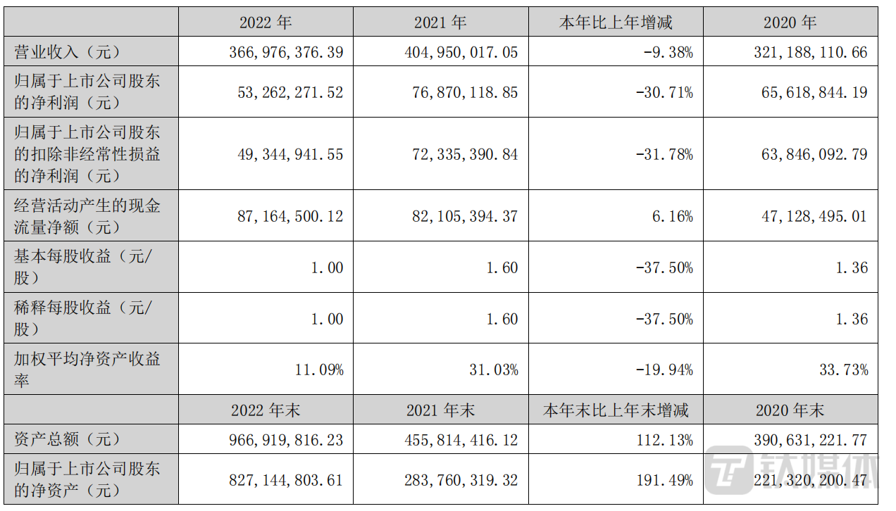 公司于2022年8月在深交所创业板上市,但是上市以后,业绩随即出现变脸。2022年度,公司实现归母净利润5326.23万元,同比减少30.71%;营业收入3.67亿元,同比下滑9.38%。值得一提的是,公司在2022年营利均出现大幅下滑,但当年仍每10股派发现金红利4元(含税),合计派现金额达到2566万元。