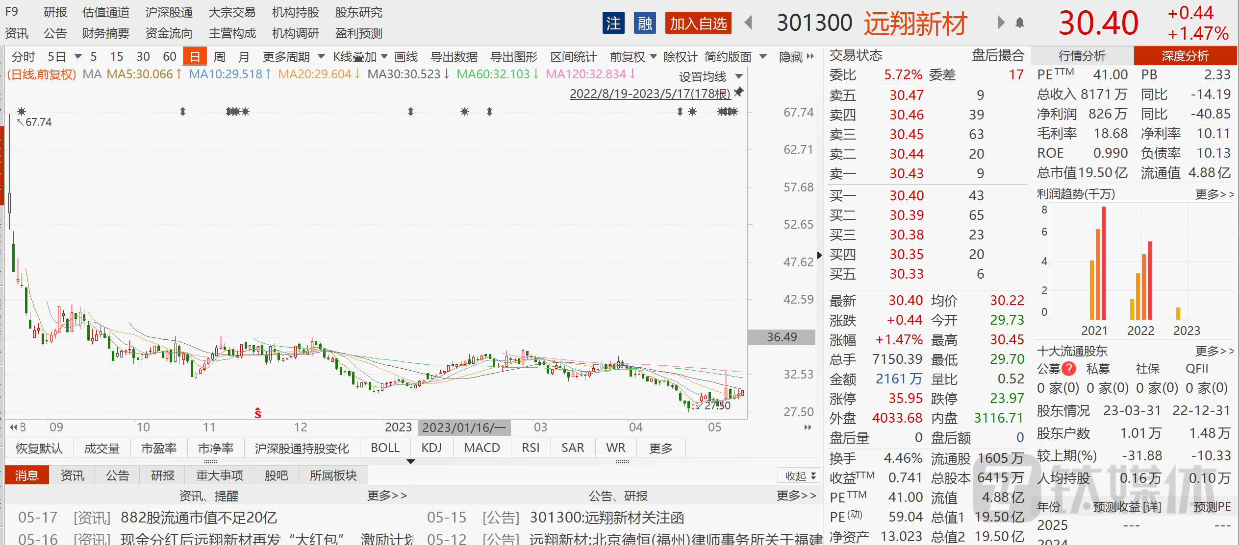 实际上,远翔新材去年刚刚在创业板上市,不过股价却是“上市即巅峰”,自上市首日至今年5月17日跌幅近45%,最大回撤近60%,目前总市值为19.5亿元。![]()