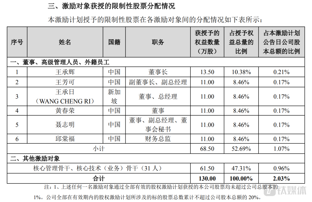 值得注意的是,王承辉获授予的权益数量为13.5万股,占授予权益总量的比例为10.38%。王芳可、王承日(WANG CHENG RI)各获得8.46%的权益比例,每人获授予的权益数量为11万股。经计算,三人合计获授予权益的比例为27.3%,占比近三成。