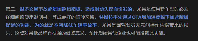 再看看文中这段引述自浙江共安检测鉴定中心朱姓高级工程师的话。把自己的过错,以及在国家市监总局的调查下不得不 OTA 召回修复过错,解读成自己再一次技术创新引领行业——特斯拉的孤傲,恐怕真的还要再坚持一会儿。