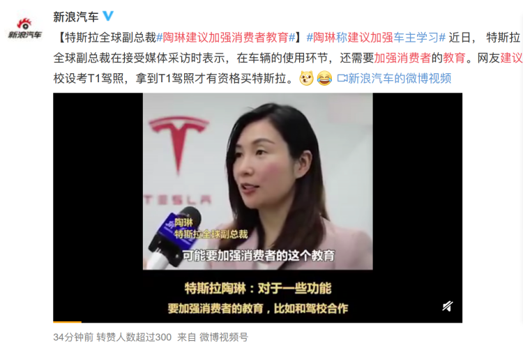 这是在2021年5月份的时候,特斯拉全球副总裁陶琳在接受中国媒体采访的时候说出的一句话。这句话在一定程度上可以算是被断章取义过度解读了,当时陶琳的上下文主要说的是跟驾校和交通部门合作,让大家了解特斯拉单踏板汽车作为新型汽车代表的使用方法,避免误操作或因为不了解功能而导致的问题。
