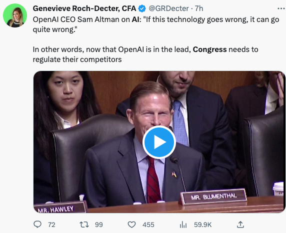 不过网友对他的这番话也不全像议员们那样买账。有推特网友就讽刺说,奥特曼的实际想法其实是,”现在OpenAI领先了,政府快来管管我们的竞争者吧。“ 许多 AI研究人员也认为这是一种反竞争行为,因为”凭证入场“对大公司有利,却可能难倒小公司、研究人员和免费的开源替代方案。
