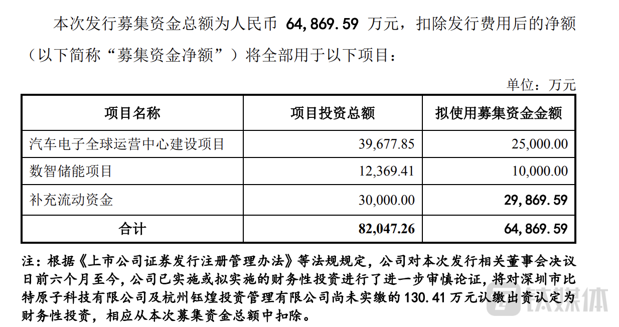 和而泰此次募集资金为6.5亿元,其中2.5亿元用于汽车电子全球运营中心建设项目(下称项目一)、1亿元用于数智储能项目(下称项目二)、3亿元用于补流。