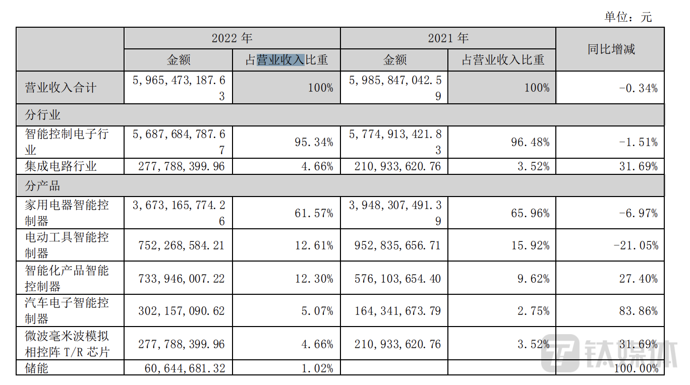 其二,是公司在汽车电子板块实现逆势增长。2022年,公司实现营收59.65亿元,同比下滑0.34%。分产品来看,虽然家用电器智能控制器、电动工具智能控制器营收贡献较大,但营收均出现下滑;相反占比较小的产品,如智能化产品智能控制器、汽车电子智能控制器等,营收实现了上涨。尤其汽车电子智能控制器产品,其营收增长了83.86%。