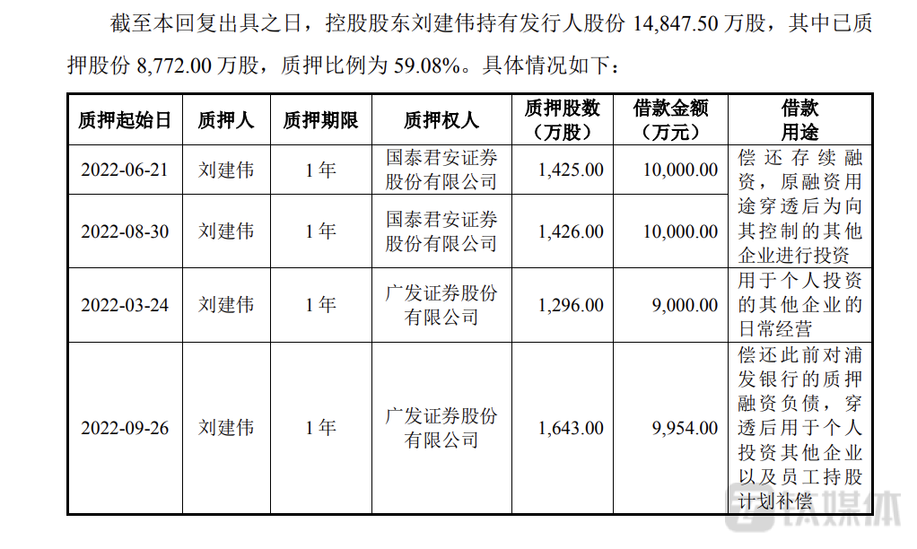 钛媒体APP注意到,在募集说明书中(注册稿)显示,截至2022年12月31日,控股股东因个人融资需求质押和而泰股份8772万股,质押比例高达59.08%。据悉,刘建伟质押其所持股票主要是为为和而泰员工持股计划提供担保并补偿员工持股亏损产生的存续融资,以及为公司以外的控股或参股企业进行投资及借款。
