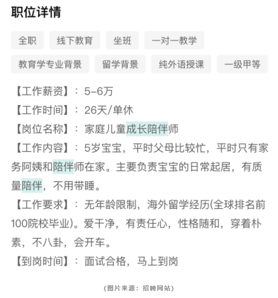 从岗位描述中可以看出,儿童成长陪伴师的工作内容主要是负责儿童的日常起居和陪伴,诸如早教、习惯培养等,薪资高、含假期、晚上不用带睡、不用做家务,实在令人羡慕。但客观来讲,除对外语和学历要求较高之外,儿童成长陪伴师的工作就是全职妈妈工作内容的一部分,此外,全职妈妈还承担着家务阿姨和育儿嫂的职责,且全年无休。