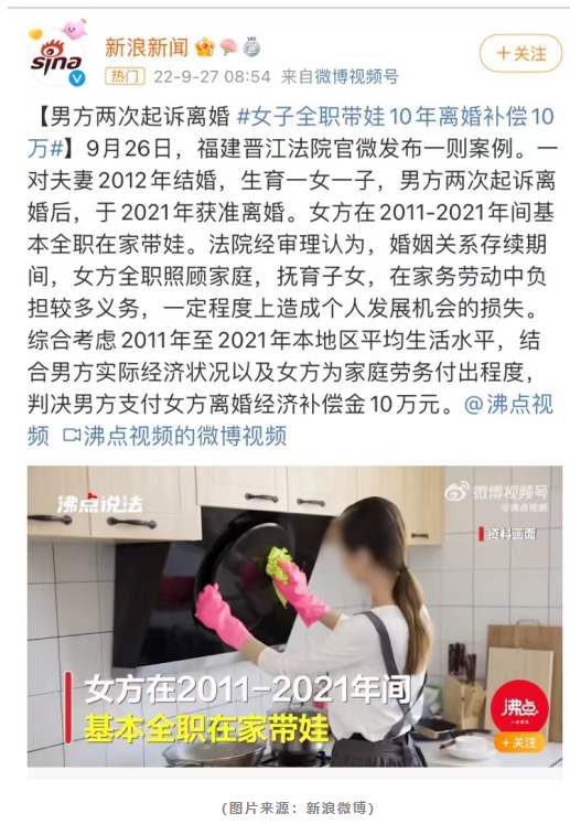 22年9月,一个“女子全职带娃离婚补偿10万”的新闻冲上热搜。福建晋江的一对夫妻结婚10年,育有一子一女,丈夫2次起诉要求离婚,法院判决书中提到:“在原、被告婚姻关系存续期间,被告全职照顾家庭,抚育子女,在家务劳动中负担较多义务,一定程度上造成个人发展机会的损失。