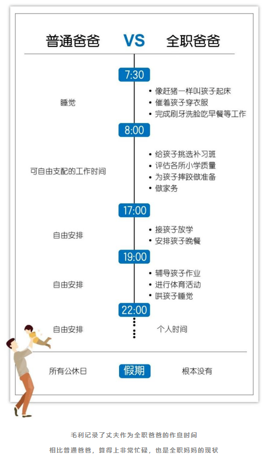 与全职妈妈的普遍相比,“全职爸爸”算是珍稀动物,作家毛利的丈夫小陈就是一名稀有的全职爸爸。在毛利和小陈都还是新手爸妈的时候,他俩约定“将来谁成功了就回来带孩子”。几年后,毛利的小说卖了版权,入账一百多万,此时小陈33岁,在公司是一个小团队的领导,月薪2万。