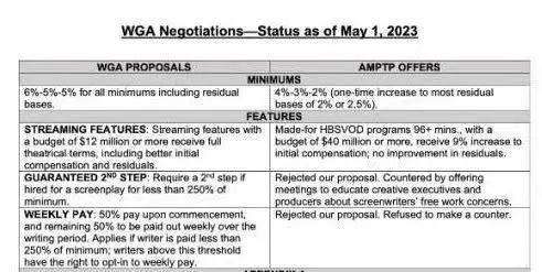 AMPTP认为强制要求雇佣6人和10周非常可笑,“这与我们行业创造性的本质不相容。”AMPTP的主席卡罗尔·隆巴尔迪尼甚至在报告中说:“编剧能有一份短期工作是很幸运的事。”