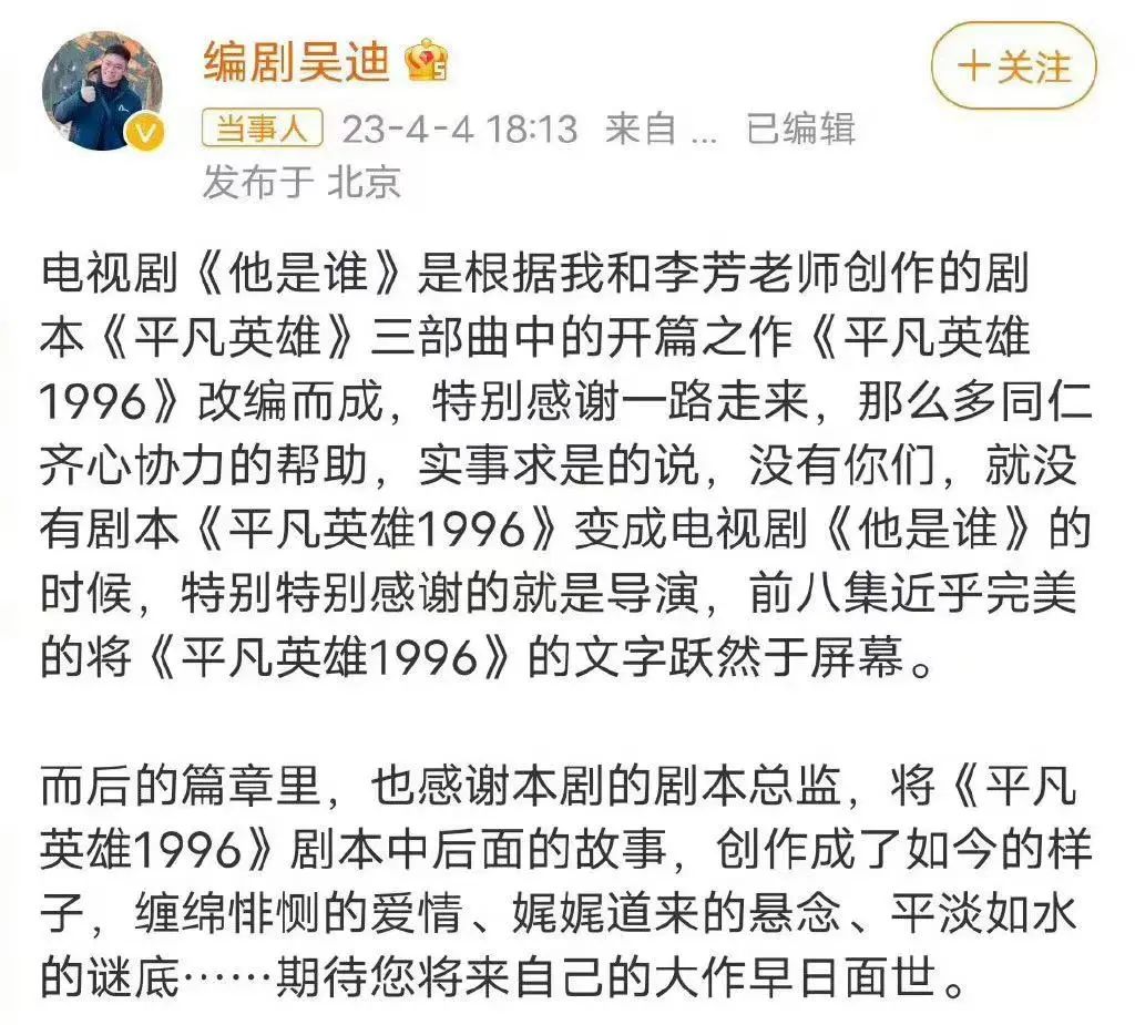 在剧集被嘲的时候,编剧是被寄刀片的那个,仅就今年,《他是谁》《长月烬明》的编剧就都在微博上隐隐吐槽过剧情并非他们所写的样子。在剧集爆红之后,编剧又是被舆论场忽视的那个。就说今年两部爆款剧,都知道《狂飙》里的高启强是张颂文,《漫长的季节》由辛爽导演,那么请问两部剧的编剧是?